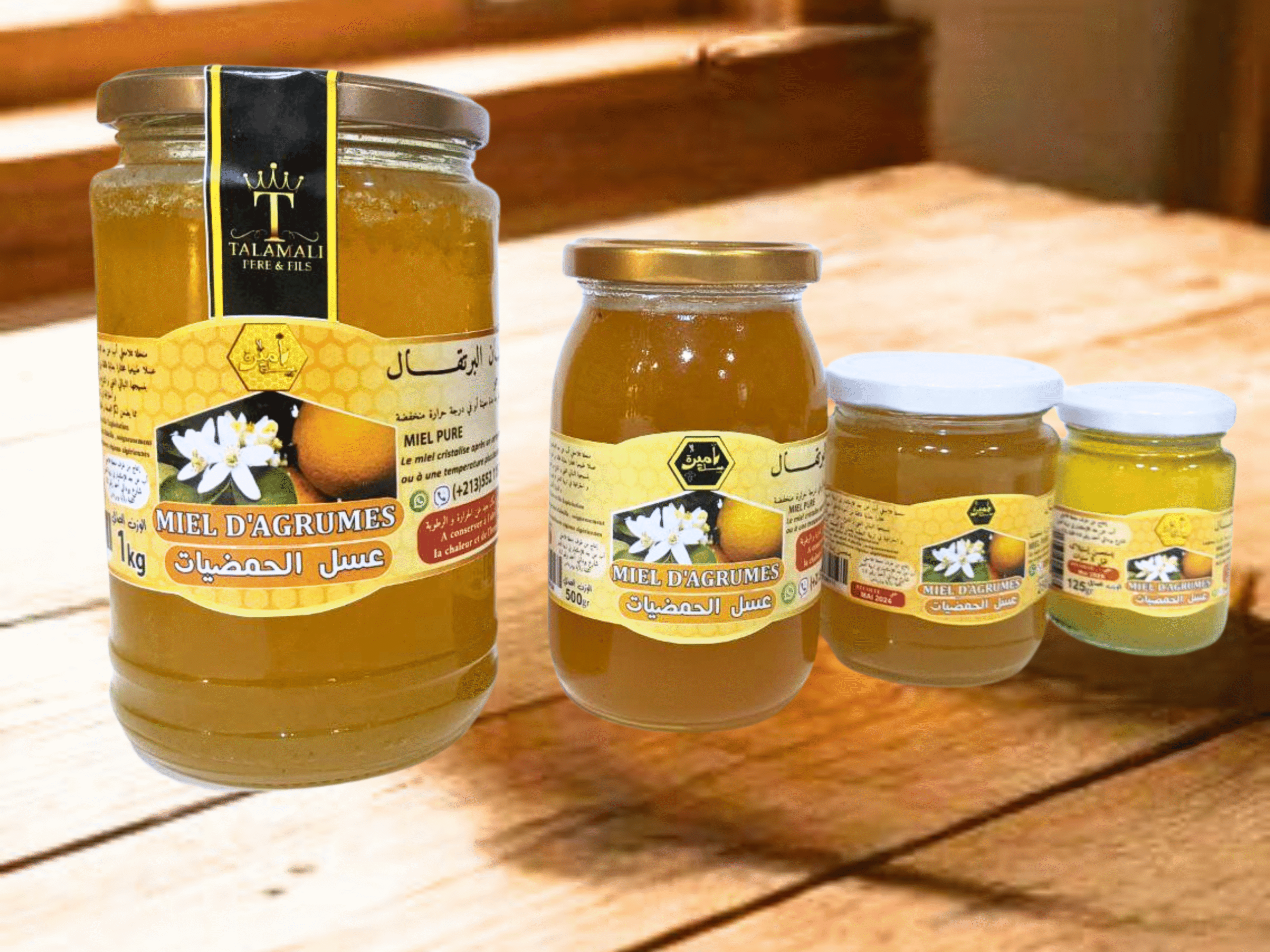 عسل طازج معتمد من ONAB، محصود يدوياً بدون تسخين أو خلط، محفوظ في عبوات زجاجية للحفاظ على طعمه ورائحته الأصلية.