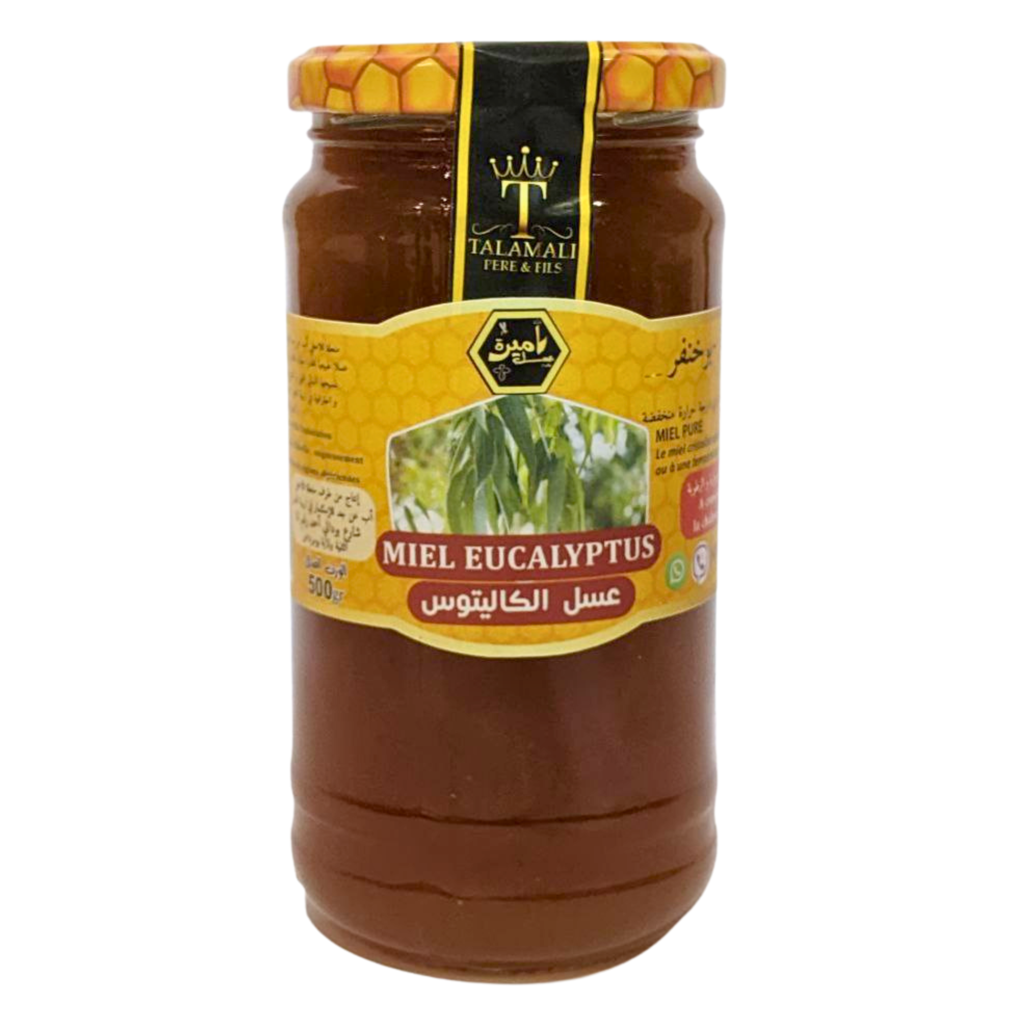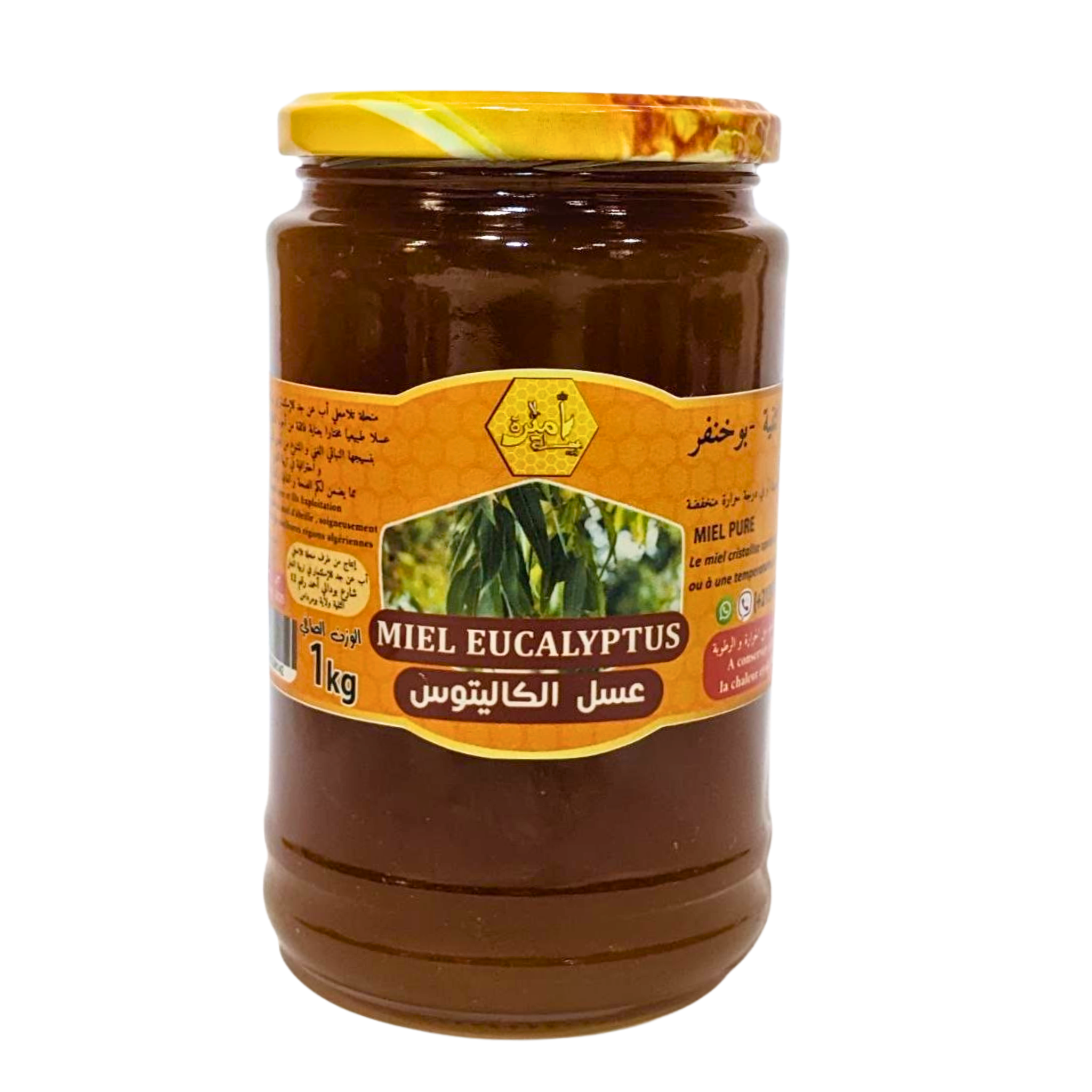 عسل من زهور الأوكاليبتوس، معتمد: رطوبة 20.2%، سكريات إجمالية 73.47%، سكريات مختزلة 68.54%، سكروز 4.68%. مثالي للجهاز التنفسي.